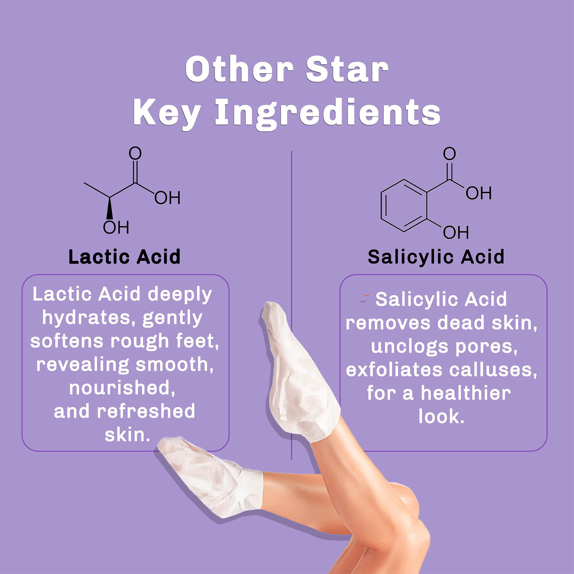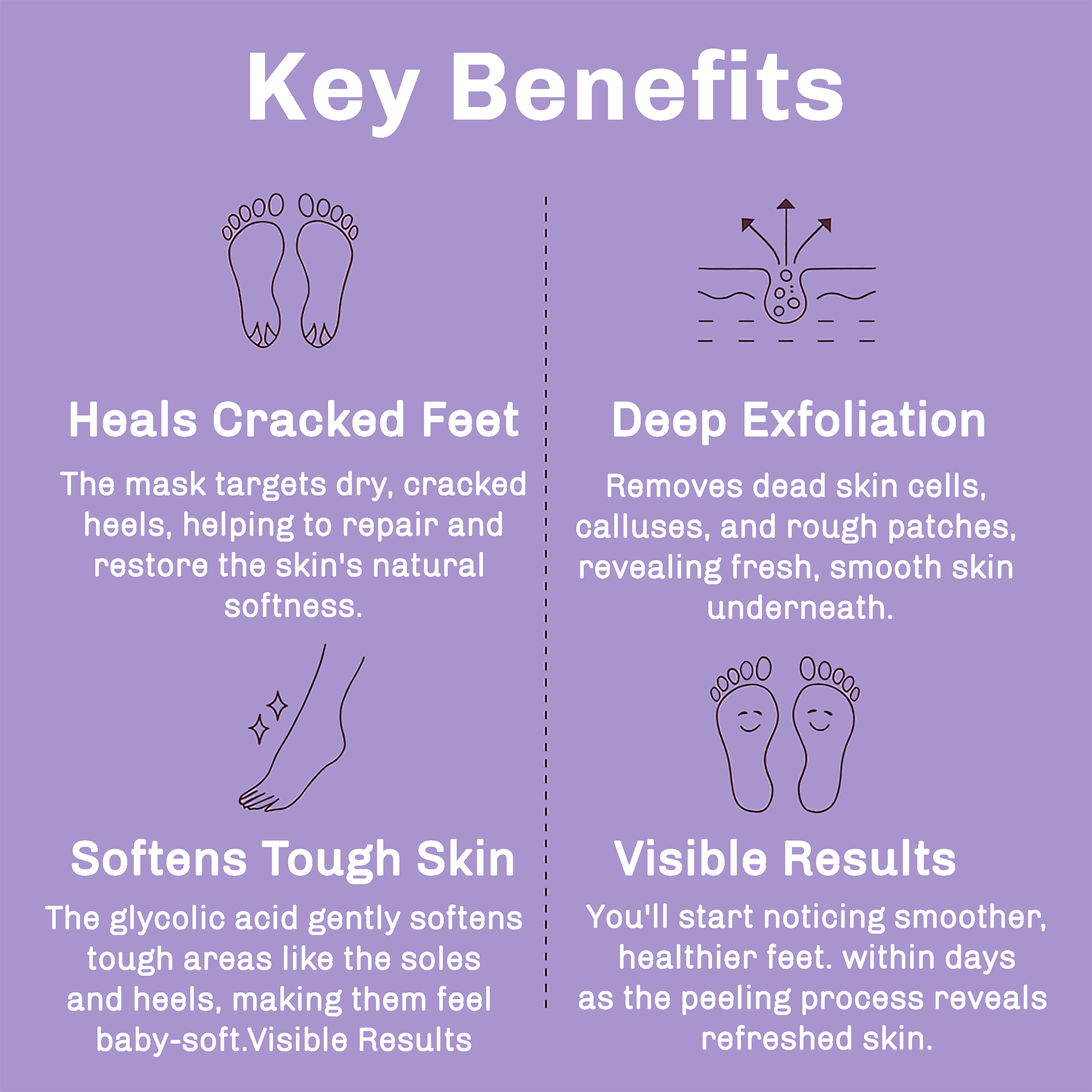 Tired of cracked heels and rough feet? Our professional-grade foot mask uses gentle fruit acids to peel away dead skin, revealing smooth, soft feet underneath.